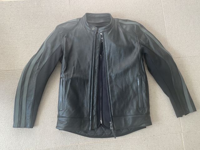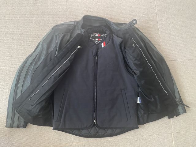 レザージャケットに装着可能な防風素材のベスト。スタンドカラーと裏地のキルティング素材が防寒性を高めています。単体でも着用できます。