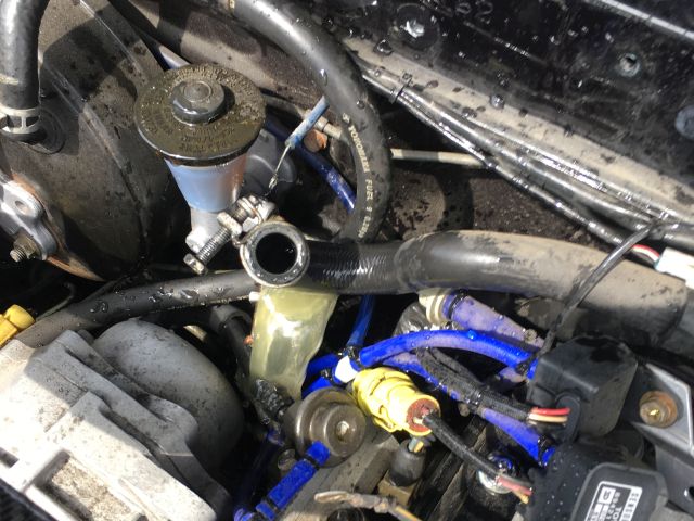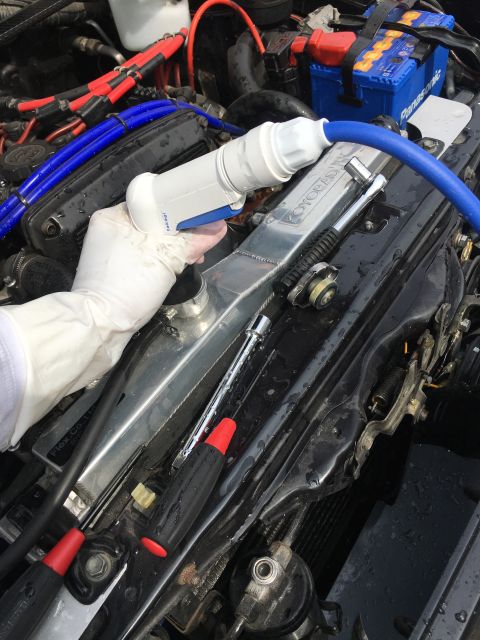ラジエーターにホースを突っ込んで、古いLLCを抜くというか押し出す。