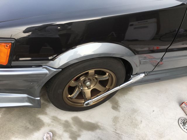 後ろは25mmのスペーサーで目視的には大丈夫に見えるが、車検的にはNGらしい。