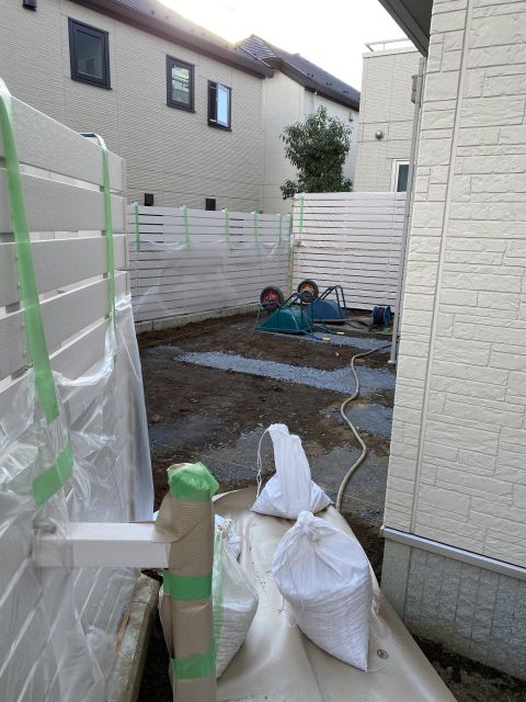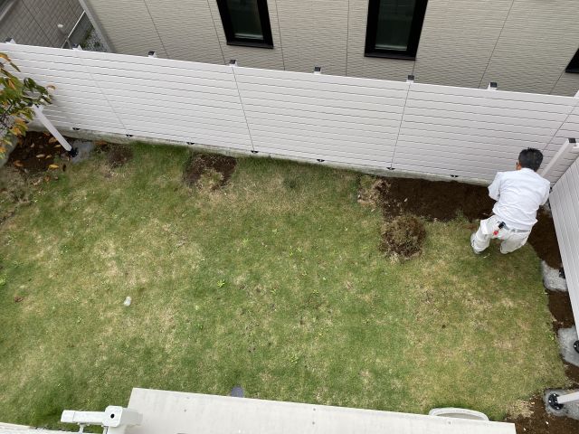 昨日は雨で雨ではねた泥が新しいフェンスについて汚くなったのもあってフェンスを養生してもらう。