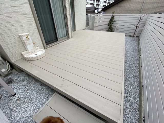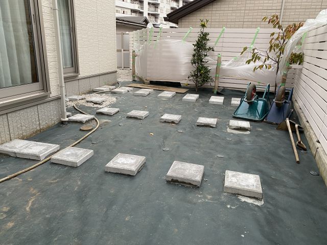 石のサイズが異なったため、ウッドデッキ施工後に見える面は同じサイズに敷きなおす。