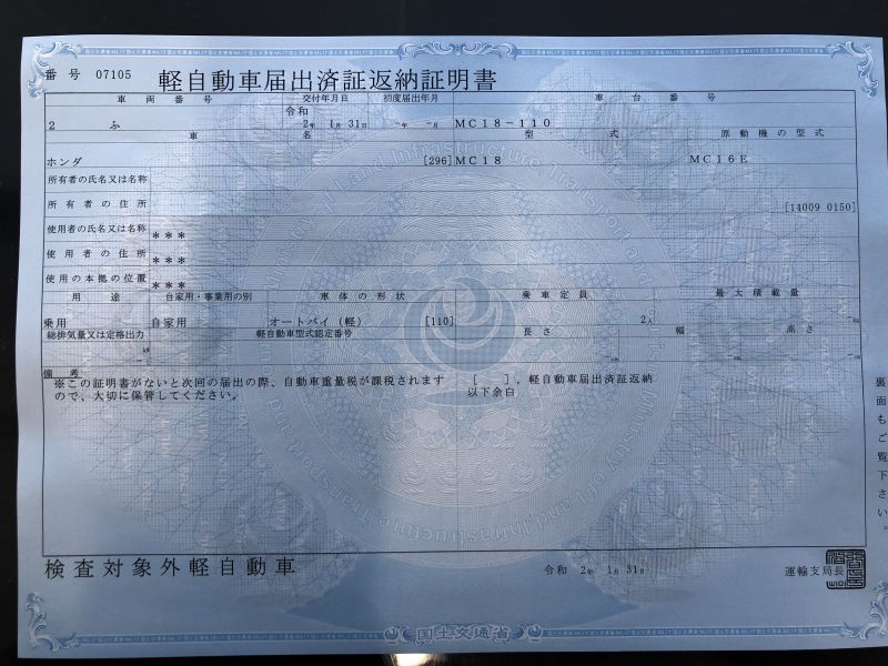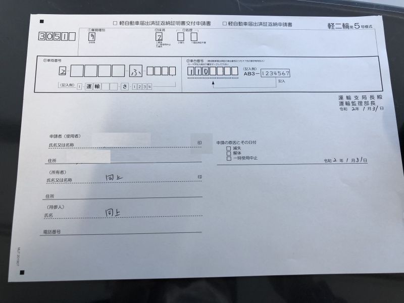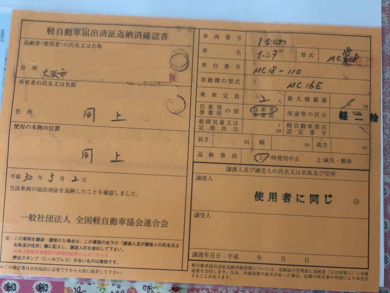 2年前に購入していた時は、このように返納書と譲渡証明書が一緒になっていたが。
