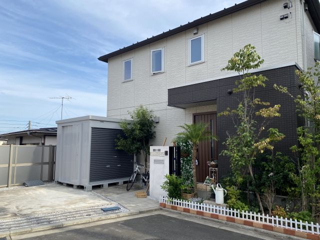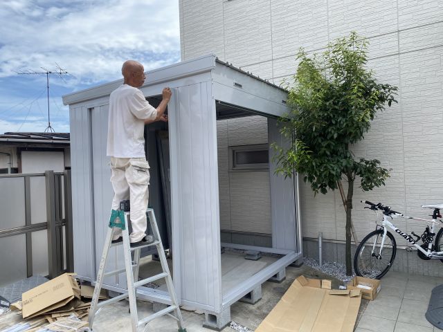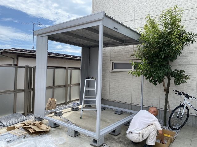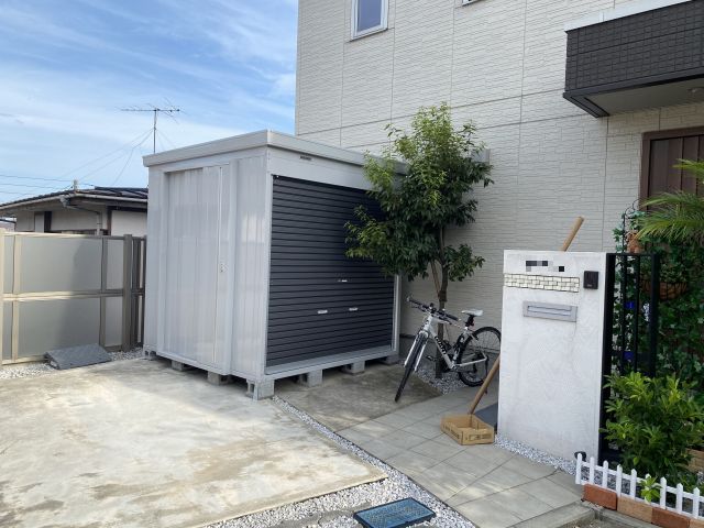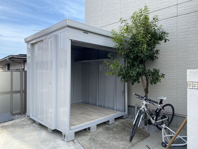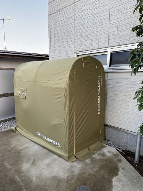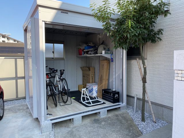 自転車サイズの簡易車庫を駐車場の片隅に設置していた。