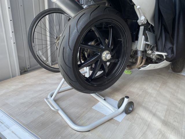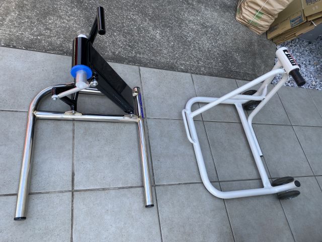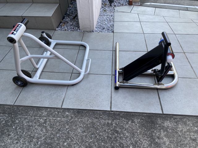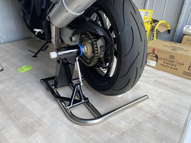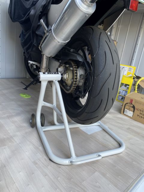 RVFは持ち上げるステーとかがなく、カウルを押し上げるわけにもいかず、タンデムステップをグイっと引き上げる感じでやっていた。