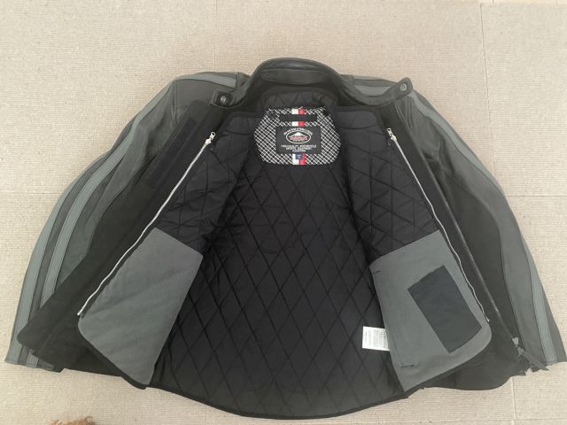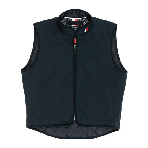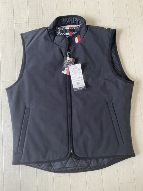 レザージャケットに装着可能な防風素材のベスト。スタンドカラーと裏地のキルティング素材が防寒性を高めています。単体でも着用できます。